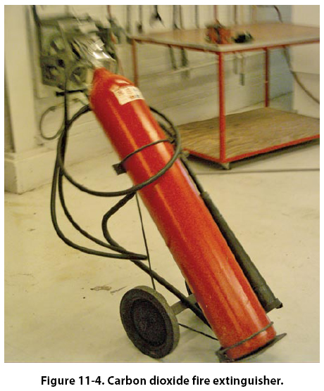Never use CO2 on Class D fires. As with water extinguishers, the cooling effect of CO2 on the hot metal can cause explosive expansion of the metal. When using CO2 fire extinguishers, all parts of the extinguisher can become extremely cold, and remain so for a short time after operation. Wear protective equipment or take other precautions to prevent cold injury (such as frostbite) from occurring. Extreme caution must be used when operating CO2 fire extinguishers in closed or confined areas. Not only can the fire be deprived of oxygen, but so too can the operator. CO2 fire extinguishers generally use the self-expelling method of operation. This means that the CO2 has sufficient pressure at normal operating pressure to expel itself. This pressure is held inside the container by some type of seal or frangible disk, which is broken or punctured by a firing mechanism, usually a pin. This means that once the seal or disk is broken, pressure in the container is released, and the fire extinguisher is spent, requiring replacement. [Figure 11-5]