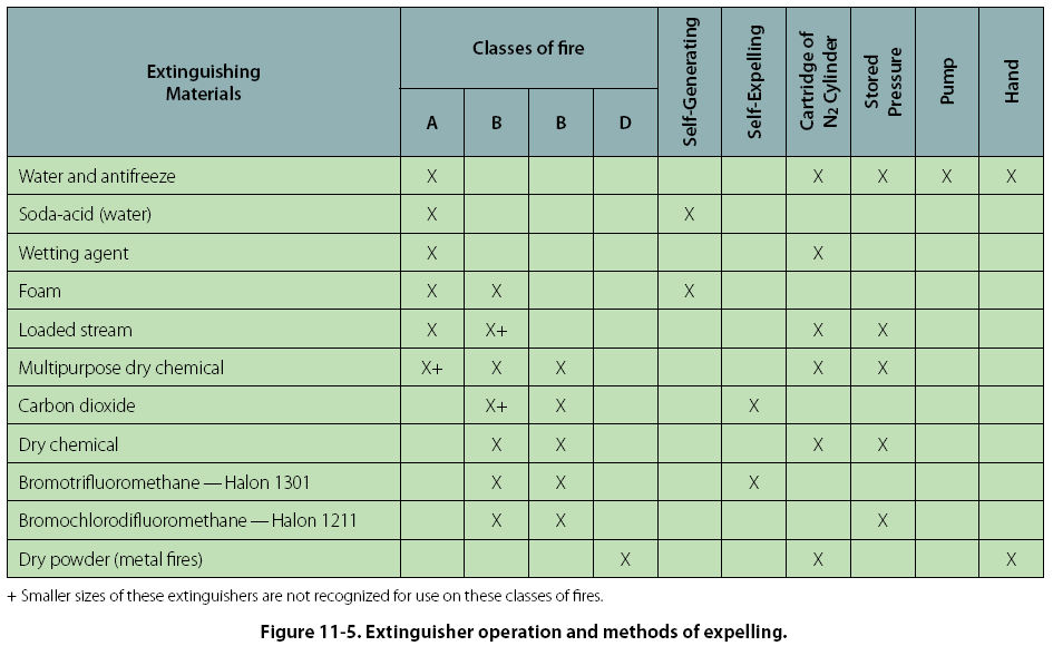Hydrochloric acid vapor, chlorine and phosgene gas are produced whenever carbon tetrachloride is used on ordinary fires. The amount of phosgene gas is increased whenever carbon tetrachloride is brought in direct contact with hot metal, certain chemicals, or continuing electrical arcs. It is not approved for any fire extinguishing use. Old containers of Halon 104 found in or around shops or hangars should be disposed of in accordance with Environmental Protection Agency (EPA) regulations and local laws and ordinances. Methyl bromide (Halon 1001), chemical formula CH3Br, is a liquefied gas with a UL toxicity rating of 2. Very toxic, it is corrosive to aluminum alloys, magnesium, and zinc. Halon 1001 is not recommended for aircraft use. Chlorobromomethane (Halon 1011), chemical formula CH2ClBr, is a liquefied gas with a UL toxicity rating of 3. Like methyl bromide, Halon 1011 is not recommended for aircraft use. Dibromodifluoromethane (Halon 1202), chemical formula CBr2F2, has a UL toxicity rating of 4. Halon 1202 is not recommended for aircraft use. Bromochlorodifluoromethane (Halon 1211), chemical formula CBrClF2, is a liquefied gas with a UL toxicity rating of 5. It is colorless, noncorrosive and evaporates rapidly leaving no residue. It does not freeze or cause cold burns, and will not harm fabrics, metals, or other materials it contacts. Halon 1211 acts rapidly on fires by producing a heavy blanketing mist that eliminates oxygen from the fire source. But more importantly, it interferes chemically with the combustion process of the fire. It has outstanding properties in preventing reflash after the fire has been extinguished. Bromotrifluoromethane (Halon 1301), chemical formula CF3Br, is also a liquefied gas with a UL toxicity rating of 6. It has all the characteristics of Halon 1211. The significant difference between the two is: Halon 1211 forms a spray similar to CO2, while Halon 1301 has a vapor spray that is more difficult to direct. Note: The Environmental Protection Agency (EPA) has restricted Halon to its 1986 production level due to its effect on the ozone layer. Dry powder extinguishers, while effective on Class B and C fires, are the best for use on Class D fires. The method of operation of dry powder fire extinguishers varies from gas cartridge charges, or stored pressure within the container which forces the powder charge out of the container, to tossing the powder on the fire by hand, by scooping pails or buckets of the powder from large containers or barrels. Dry powder is not recommended for aircraft use (except on metal fires as a fire extinguisher) because the leftover chemical residues and dust often make cleanup difficult, and can damage electronic or other delicate equipment. |