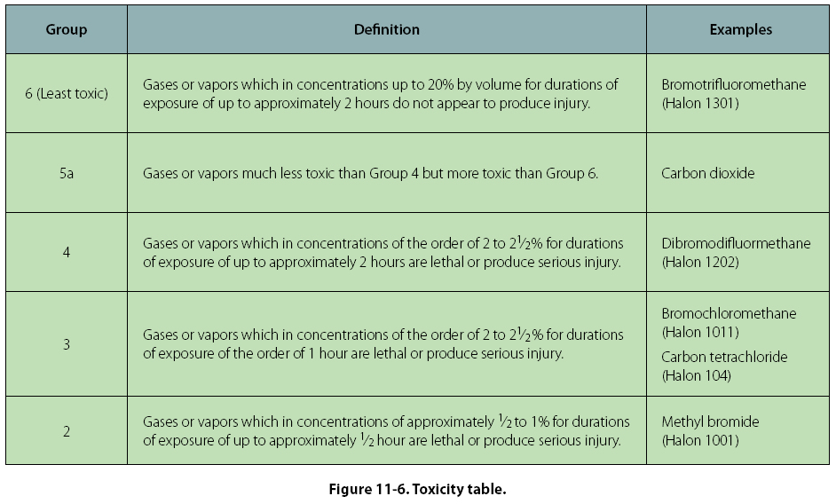 Halogenated hydrocarbon extinguishers are most effective on Class B and C fires. They can be used on Class A and D fires but they are less effective. Halogenated hydrocarbon, (commonly called Freon™ by the industry), are numbered according to chemical formulas with Halon™ numbers. Carbon tetrachloride (Halon 104), chemical formula CCl4, has an Underwriters Laboratory (UL) toxicity rating of 3. As such, it is extremely toxic. [Figure 11-6]