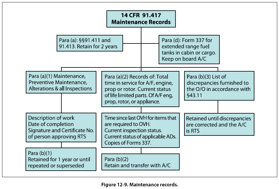 Paragraph (d) refers to the installation of fuel tanks in the cabin or cargo area. The FAA Form 337 authorizing this installation must be kept on board the aircraft all the time. Note: Other than this paragraph, there is no requirement that the maintenance records of the aircraft be carried on the aircraft. In fact, there are very logical reasons that in most cases they shouldn’t be. The two biggest concerns are damaged or lost records. It is much safer to retain the logs in a filing system in the office. It is also a very wise idea to have the logbook copied or scanned, and retained at a separate location should a catastrophic event (fire, flood, tornado, hurricane, and so forth) occur at the site the original records are retained. Subparagraph (a)(1) then lists those records which are later defined in (b)(1) as being only retained for 1 year or until the work is repeated or superseded. Subparagraph (a)(2) specifies the records that are permanent records, and are identified in subparagraph (b)(2) as those which must be transferred with the aircraft. Refer to the chart for further clarification. [Figure 12-9] Paragraph (c) requires that all of the maintenance records mandated by this section be made available upon request to the Administrator or any authorized representative of the National Transportation Safety Board. Furthermore, the owner/operator must provide the Form 337 required to be aboard the aircraft whenever additional fuel tanks are installed in either the passenger compartment or the baggage compartment (per paragraph (d)) to any law enforcement officer upon request. §91.419 — Transfer of maintenance records When an aircraft is sold, it is logical that the records are transferred with it. They may be either in plain language or coded. However, the purchaser may elect to permit the seller to retain the actual records, but if that occurs, the purchaser (now the current owner/operator) must still make available upon request, these records to either the FAA or the NTSB. §91.421 — Rebuilt engine maintenance records This section presents the term “zero time." Although not truly given as a definition, the wording of the regulation is very clear that an aircraft engine, when rebuilt by the engine manufacturer or an agency approved by the manufacturer, may be given a new maintenance record, showing no previous operating history. This new record must include a signed statement with the date it was rebuilt, any changes incorporated by compliance with AD notes, and compliance with any of the manufacturer’s service bulletins. |