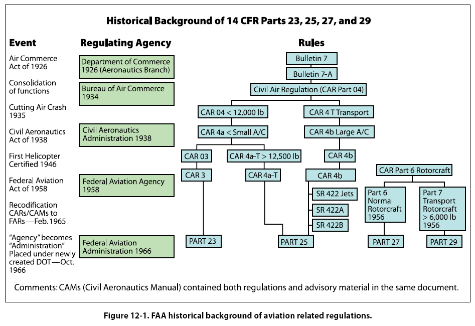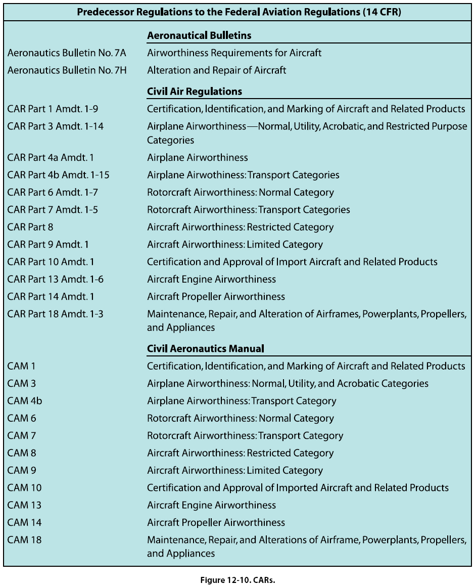 The CARs were part of the original certification basis for aircraft first certified in the 1940s, 1950s, and 1960s by the CAA. Therefore, the CARs may still be needed as a reference for these older aircraft. [Figure 12-10]