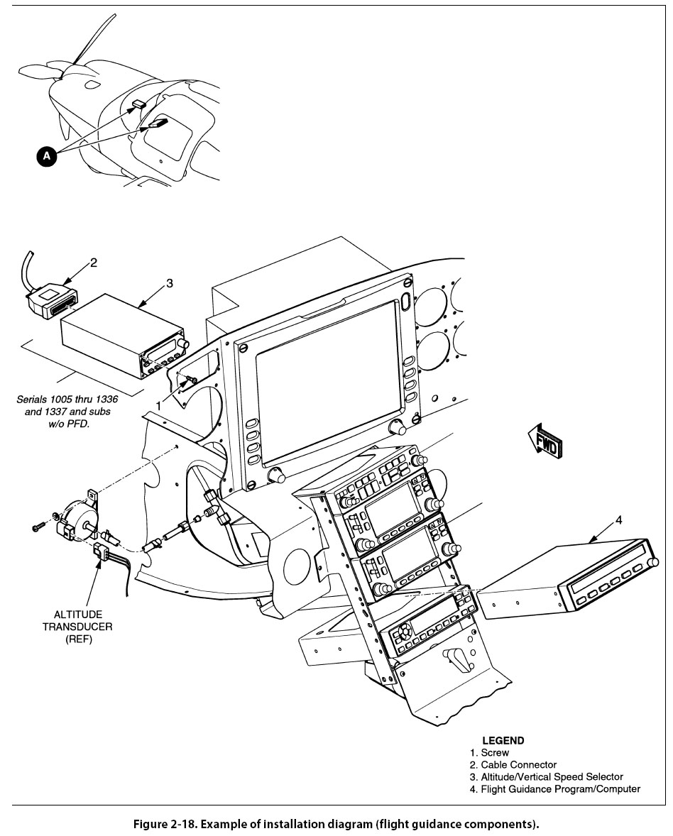 Figure 2-18 is an example of an installation diagram. This is a diagram of the installation of the flight guidance control components of an aircraft. It identifies each of the components in the systems and shows their location in the aircraft. Each number (1, 2, 3, and 4) on the detail shows the location of the individual flight guidance system components within the cockpit of the aircraft. Installation diagrams are used extensively in aircraft maintenance and repair manuals, and are invaluable in identifying and locating components and understanding the operation of various systems. |