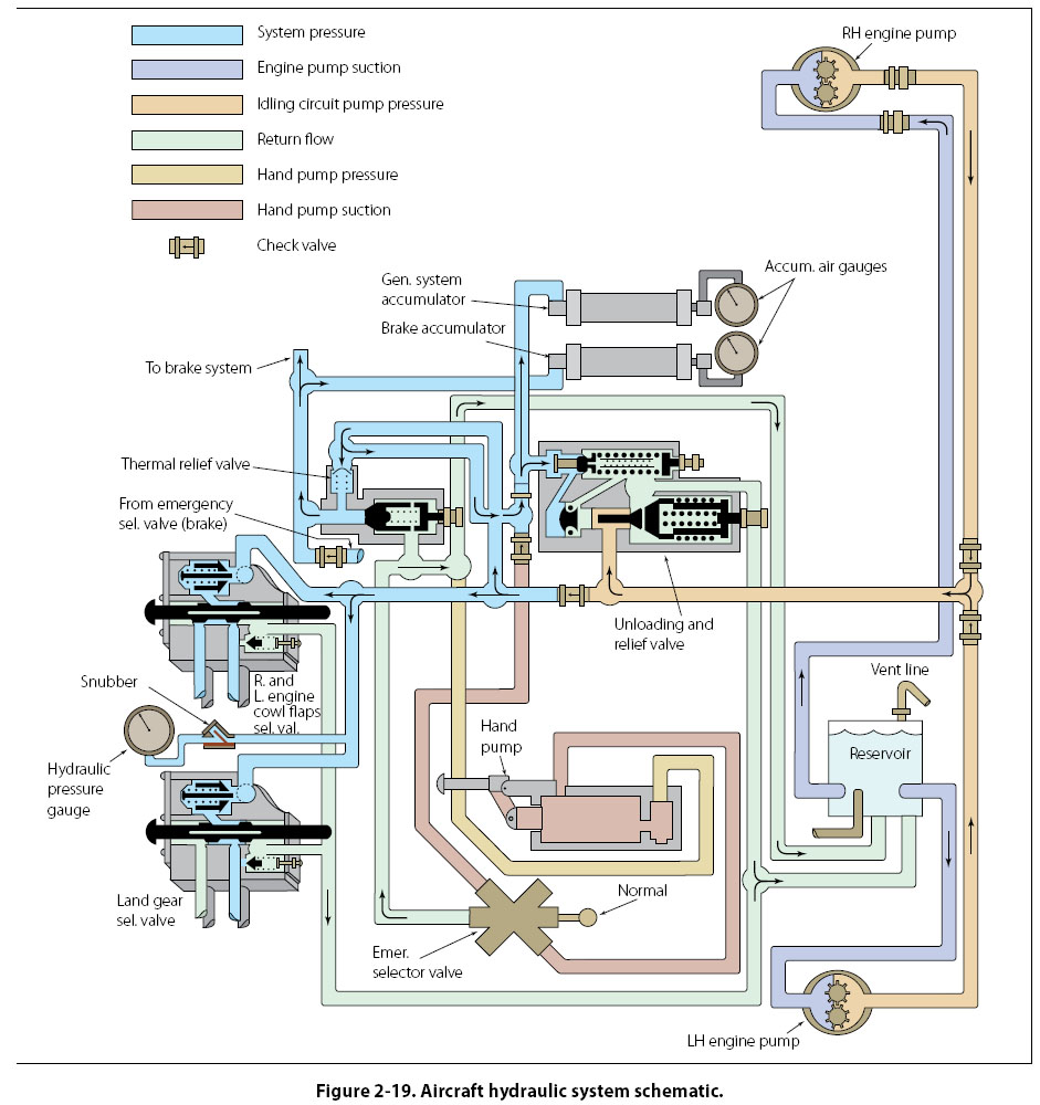 Schematic Diagrams Schematic diagrams do not indicate the location of individual components in the aircraft, but locate components with respect to each other within the system. Figure 2-19 illustrates a schematic diagram of an aircraft hydraulic system. The hydraulic pressure gauge is not necessarily located above the landing gear selector valve in the aircraft. It is, however, connected to the pressure line that leads to the selector valve.