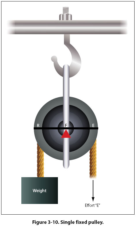 and brake assembly at the bottom of the landing gear is the resistance. The hydraulic actuator that makes the gear retract is attached somewhere in the middle, and that is the applied effort. The Pulley Pulleys are simple machines in the form of a wheel mounted on a fixed axis and supported by a frame. The wheel, or disk, is normally grooved to accommodate a rope. The wheel is sometimes referred to as a “sheave" (sometimes “sheaf"). The frame that supports the wheel is called a block. A block and tackle consists of a pair of blocks. Each block contains one or more pulleys and a rope connecting the pulley(s) of each block. Single Fixed Pulley A single fixed pulley is really a first class lever with equal arms. In Figure 3-10, the arm from point “R" to point “F" is equal to the arm from point “F" to point “E" (both distances being equal to the radius of the pulley). When a first class lever has equal arms, the mechanical advantage is 1. Thus, the force of the pull on the rope must be equal to the weight of the object being lifted. The only advantage of a single fixed pulley is to change the direction of the force, or pull on the rope.