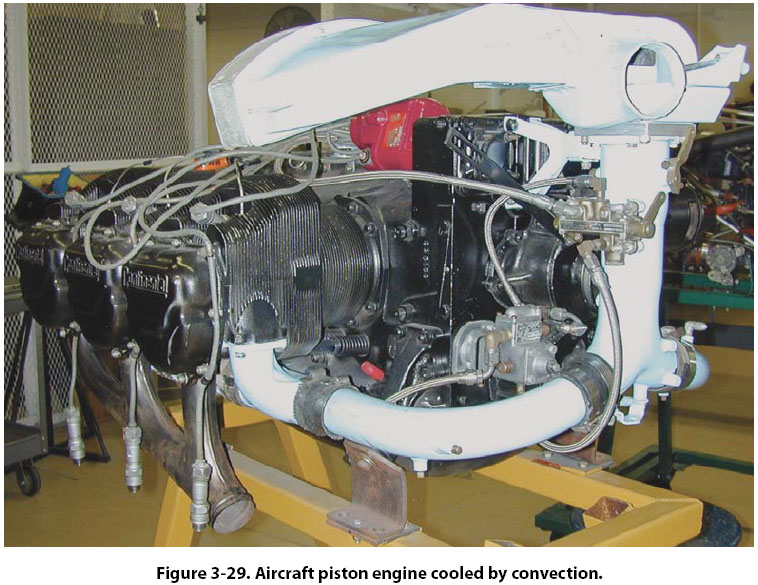 Convection Convection is the process by which heat is transferred by movement of a heated fluid (gas or liquid). For example, an incandescent light bulb will, when heated, become increasingly hotter until the air surrounding it begins to move. The motion of the air is upward. This upward motion of the heated air carries the heat away from the hot light bulb by convection. Transfer of heat by convection may be hastened by using a ventilating fan to move the air surrounding a hot object. The rate of cooling of a hot electronics component, such as the CPU in a computer, can be increased if it is provided with copper fins that conduct heat away from the hot surface. The fins provide large surfaces against which cool air can be blown. A convection process may take place in a liquid as well as in a gas. A good example of this is a pan of water sitting on the stove. The bottom of the pan becomes hot because it conducts heat from the surface it is in contact with. The water on the bottom of the pan also heats up because of conduction. As the heated water starts to rise and cooler water moves in to take its place, the convection process begins. When the circulation of gas or liquid is not rapid enough to remove sufficient heat, fans or pumps are used to accelerate the motion of the cooling material. In some installations, pumps are used to circulate water or oil to help cool large equipment. In airborne installations, electric fans and blowers are used to aid convection. An aircraft air-cooled piston engine is a good example of convection being used to transfer heat. The engine shown in Figure 3-29 is a Continental IO-520, with six heavily finned air-cooled cylinders. This engine does not depend on natural convection for cooling, but rather forced air convection coming from the propeller on the engine. The heat generated inside the engine finds its way to the cylinder cooling fins by conduction, meaning transfer within the metal of the cylinder. Once the heat gets to the fins, forced air flowing around the cylinders carries the heat away.