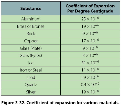Thermal Expansion/Contraction Thermal expansion takes place in solids, liquids, and gases when they are heated. With few exceptions, solids will expand when heated and contract when cooled. Because the molecules of solids are much closer together and are more strongly attracted to each other, the expansion of solids when heated is very slight in comparison to the expansion in liquids and gases. The expansion of fluids is discussed in the study of Boyle’s law. Thermal expansion in solids must be explained in some detail because of its close relationship to aircraft metals and materials. Because some substances expand more than others, it is necessary to measure experimentally the exact rate of expansion of each one. The amount that a unit length of any substance expands for a one degree rise in temperature is known as the coefficient of linear expansion for that substance. The coefficient of linear expansion for various materials is shown in Figure 3-32.