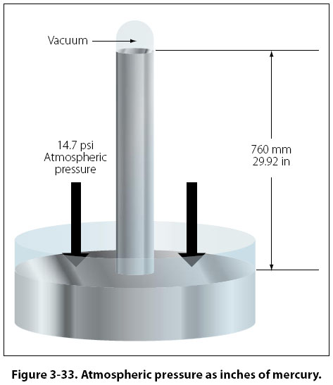To estimate the expansion of any object, such as a steel rail, it is necessary to know three things about it: its length, the rise in temperature to which it is subjected, and its coefficient of expansion. This relationship is expressed by the equation: Expansion = (coefficient) × (length) × (rise in temperature) If a steel rod measures exactly 9 ft at 21°C, what is its length at 55°C? The coefficient of expansion for steel is 11 × 10-6. Expansion = (11 × 10-6) × (9 feet) × 34° This amount, when added to the original length of the rod, makes the rod 9.003366 ft long. Its length has only increased by 4/100 of an inch. The increase in the length of the rod is relatively small, but if the rod were placed where it could not expand freely, there would be a tremendous force exerted due to thermal expansion. Thus, thermal expansion must be taken into consideration when designing airframes, powerplants, or related equipment. Pressure Pressure is the amount of force acting on a specific amount of surface area. The force is typically measured in pounds and the surface area in square inches, making the units of pressure pounds per square inch or psi. If a 100-lb weight was placed on top of a block with a surface area of 10 in2, the average weight distribution would be 10 lb for each of the square inches (100 ÷ 10), or 10 psi. When atmospheric pressure is being measured, in addition to psi, other means of pressure measurement can be used. These include inches or millimeters of mercury, and millibars. Standard day atmospheric pressure is equal to 14.7 psi, 29.92 inches of mercury ("Hg), 760 millimeters of mercury (mm Hg), or 1013.2 millibars. The relationship between these units of measure is as follows: 1 psi = 2.04 "Hg The concept behind measuring pressure in inches of mercury involves filling a test tube with the liquid mercury and then covering the top. The test tube is then turned upside down and placed in an open container of mercury, and the top is uncovered. Gravity acting on the mercury in the test tube will try to make the mercury run out. Atmospheric pressure pushing down on the mercury in the open container tries to make the mercury stay in the test tube. At some point these two forces (gravity and atmospheric pressure) will equal out and the mercury will stabilize at a certain height in the test tube. Under standard day atmospheric conditions, the air in a 1-in2 column extending all the way to the top of the atmosphere would weigh 14.7 lb. A 1 in2 column of mercury, 29.92 inches tall, would also weigh 14.7 lb. That is why 14.7 psi is equal to 29.92 "Hg. Figure 3-33 demonstrates this point.