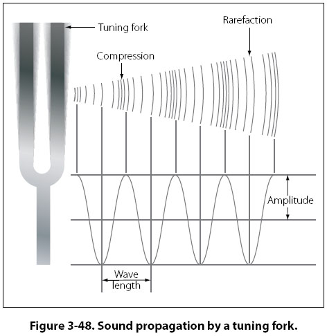 Sound travels through matter in the form of longitudinal wave motions. These waves are called longitudinal waves because the particles of the medium vibrate back and forth longitudinally in the direction of propagation. [Figure 3-48] When the tine of a tuning fork moves in an outward direction, the air immediately in front of the tine is compressed so that its momentary pressure is raised above that at other points in the surrounding medium. Because air is elastic, this disturbance is transmitted progressively in an outward direction from the tine in the form of a compression wave.