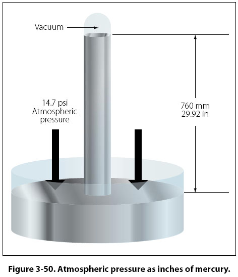 Atmospheric Pressure The human body is under pressure, since it exists at the bottom of a sea of air. This pressure is due to the weight of the atmosphere. On a standard day at sea level, if a 1-in2 column of air extending to the top of the atmosphere was weighed, it would weigh 14.7 lb. That is why standard day atmospheric pressure is said to be 14.7 pounds per square inch (14.7 psi). Since atmospheric pressure at any altitude is due to the weight of air above it, pressure decreases with increased altitude. Obviously, the total weight of air above an area at 15,000 ft would be less than the total weight of the air above an area at 10,000 ft. Atmospheric pressure is often measured by a mercury barometer. A glass tube somewhat over 30 inches in length is sealed at one end and then filled with mercury. It is then inverted and the open end placed in a dish of mercury. Immediately, the mercury level in the inverted tube will drop a short distance, leaving a small volume of mercury vapor at nearly zero absolute pressure in the tube just above the top of the liquid mercury column. Gravity acting on the mercury in the tube will try to make the mercury run out. Atmospheric pressure pushing down on the mercury in the open container tries to make the mercury stay in the tube. At some point these two forces (gravity and atmospheric pressure) will equilibrate and the mercury will stabilize at a certain height in the tube. Under standard day atmospheric conditions, the air in a 1-in2 column extending to the top of the atmosphere would weigh 14.7 lb. A 1-in2 column of mercury, 29.92 inches tall, would also weigh 14.7 lb. That is why 14.7 psi is equal to 29.92 "Hg. Figure 3-50 demonstrates this point.