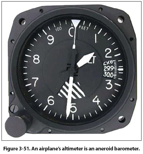 A second means of measuring atmospheric pressure is with an aneroid barometer. This mechanical instrument is a much better choice than a mercury barometer for use on airplanes. Aneroid barometers (altimeters) are used to indicate altitude in flight. The calibrations are made in thousands of feet rather than in psi or inches of mercury. For example, the standard pressure at sea level is 29.92 "Hg, or 14.7 psi. At 10,000 feet above sea level, standard pressure is 20.58 "Hg, or 10.10 psi. Altimeters are calibrated so that if the pressure exerted by the atmosphere is 10.10 psi, the altimeter will point to 10,000 ft. [Figure 3-51]