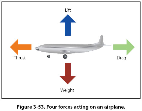 Aircraft Theory of Flight Before a technician can consider performing maintenance on an aircraft, it is necessary to understand the pieces that make up the aircraft. Names like fuselage, empennage, wing, and so many others, come into play when describing what an airplane is and how it operates. For helicopters, names like main rotor, anti-torque rotor, and autorotation come to mind as a small portion of what needs to be understood about rotorcraft. The study of physics, which includes basic aerodynamics, is a necessary part of understanding why aircraft operate the way they do. Four Forces of Flight During flight, there are four forces acting on an airplane. These forces are lift, weight, thrust, and drag. [Figure 3-53] Lift is the upward force created by the wing, weight is the pull of gravity on the airplane’s mass, thrust is the force created by the airplane’s propeller or turbine engine, and drag is the friction caused by the air flowing around the airplane.