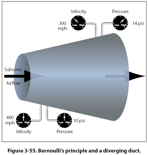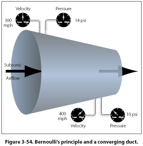 All four of these forces are measured in pounds. Any time the forces are not in balance, something about the airplane’s condition is changing. The possibilities are as follows: 1. When an airplane is accelerating, it has more thrust than drag. 2. When an airplane is decelerating, it has less thrust than drag. 3. When an airplane is at a constant velocity, thrust and drag are equal. 4. When an airplane is climbing, it has more lift than weight. 5. When an airplane is descending, it has more weight than lift. 6. When an airplane is at a constant altitude, lift and weight are equal. Bernoulli’s Principle and Subsonic Flow The basic concept of subsonic airflow and the resulting pressure differentials was discovered by Daniel Bernoulli, a Swiss physicist. Bernoulli’s principle, as we refer to it today, states that “as the velocity of a fluid increases, the static pressure of that fluid will decrease, provided there is no energy added or energy taken away." A direct application of Bernoulli’s principle is the study of air as it flows through either a converging or a diverging passage, and to relate the findings to some aviation concepts. A converging shape is one whose cross-sectional area gets progressively smaller from entry to exit. A diverging shape is just the opposite, with the cross-sectional area getting larger from entry to exit. Figure 3-54 shows a converging shaped duct, with the air entering on the left at subsonic velocity and exiting on the right.