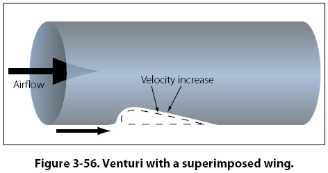 In the discussion of Bernoulli’s principle earlier in this chapter, a venturi was shown in Figure 3-46. In Figure 3-56, a venturi is shown again, only this time a wing is shown tucked up into the recess where the venturi’s converging shape is. There are two arrows showing airflow. The large arrow shows airflow within the venturi, and the small arrow shows airflow on the outside heading toward the leading edge of the wing. In the converging part of the venturi, velocity would increase and static pressure would decrease. The same thing would happen to the air flowing around the wing, with the velocity over the top increasing and static pressure decreasing. In Figure 3-56, the air reaching the leading edge of the wing separates into two separate flows. Some of the air goes over the top of the wing and some travels along the bottom. The air going over the top, because of the curvature, has farther to travel. With a greater distance to travel, the air going over the top must move at a greater velocity. The higher velocity on the top causes the static pressure on the top to be less than it is on the bottom, and this difference in static pressures is what creates lift.