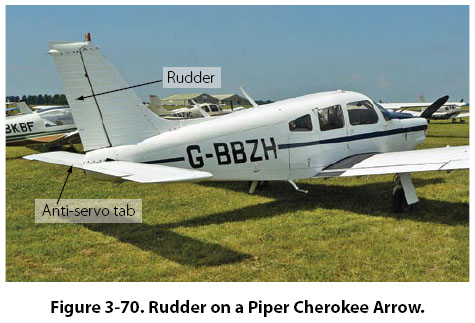 Flight Controls and the Vertical Axis The vertical axis of an airplane runs from top to bottom through the middle of the airplane, passing through the center of gravity. Movement around this axis is known as yaw, and control around this axis is called directional control. Movement around this axis is controlled by the rudder, or in the case of the Beechcraft Bonanza in Figure 3-67, by the ruddervators. The feet of the pilot are on the rudder pedals, and pushing on the left or right rudder pedal makes the rudder move left or right. When the right rudder pedal is pushed, the trailing edge of the rudder moves to the right, and the nose of the airplane yaws to the right. The rudder pedals of a Cessna 182 can be seen in Figure 3-68. Even though the rudder of the airplane will make the nose yaw to the left or the right, the rudder is not what turns the airplane. For what is called a coordinated turn to occur, both the ailerons and rudder come into play. Let’s say we want to turn the airplane to the right. We start by turning the control wheel to the right, which raises the right aileron and lowers the left aileron and initiates the banking turn. The increased lift on the left wing also increases the induced drag on the left wing, which tries to make the nose of the airplane yaw to the left. To counteract this, when the control wheel is moved to the right, a small amount of right rudder is used to keep the nose of the airplane from yawing to the left. Once the nose of the airplane is pointing in the right direction, pressure on the rudder is no longer needed. The rudder of a Piper Cherokee Arrow can be seen in Figure 3-70.