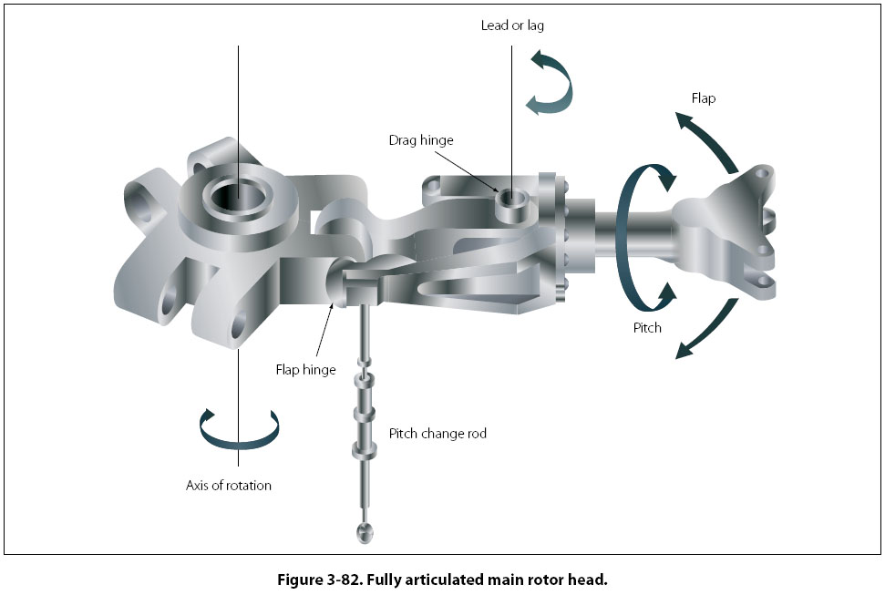 Main Rotor Systems The classification of main rotor systems is based on how the blades move relative to the main rotor hub. The principal classifications are known as fully articulated, semi-rigid, and rigid. In the fully articulated rotor system, the blades are attached to the hub with multiple hinges. The blades are hinged in a way that allows them to move up and down and fore and aft, and bearings provide for motion around the pitch change axis. Rotor systems using this type of arrangement typically have three or more blades. The hinge that allows the blades to move up and down is called the flap hinge, and movement around this hinge is called flap. The hinge that allows the blades to move fore and aft is called a drag or lag hinge. Movement around this hinge is called dragging, lead/lag, or hunting. These hinges and their associated movement are shown in Figure 3-82.