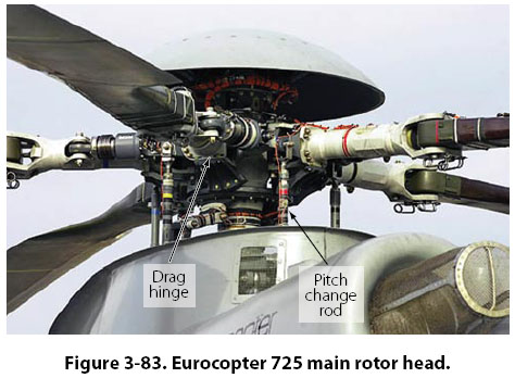The main rotor head of a Eurocopter model 725 is shown in Figure 3-83, with the drag hinge and pitch change rods visible.