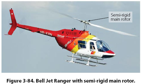 The semi-rigid rotor system is used with a two blade main rotor. The blades are rigidly attached to the hub, with the hub and blades able to teeter like a seesaw. The teetering action allows the blades to flap, with one blade dropping down while the other blade rises. The blades are able to change pitch independently of each other. Figure 3-84 shows a Bell Jet Ranger helicopter in flight. This helicopter uses a semi-rigid rotor system, which is evident because of the way the rotor is tilted forward when the helicopter is in forward flight.