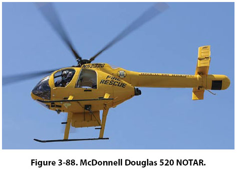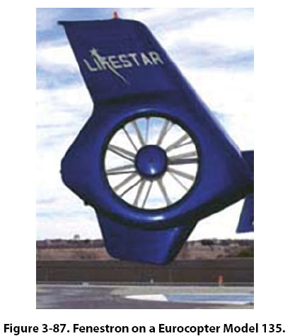 An alternative to the tail rotor seen in Figure 3-86 is a type of anti-torque rotor known as a fenestron, or “fan-in-tail" design as seen in Figure 3-87. Because the rotating blades in this design are enclosed in a shroud, they present less of a hazard to personnel on the ground and they create less drag in flight.