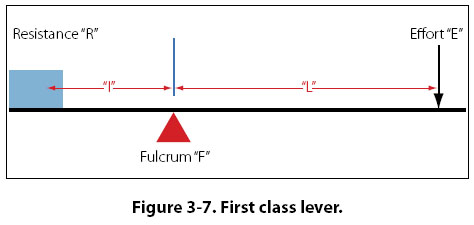 The Lever The simplest machine, and perhaps the most familiar one, is the lever. A seesaw is a familiar example of a lever, with two people sitting on either end of a board and a pivoting point in the middle. There are three basic parts in all levers. They are the fulcrum “F," a force or effort “E," and a resistance “R." Shown in Figure 3-7 are the pivot point “F" (fulcrum), the effort “E" which is applied at a distance “L" from the fulcrum, and a resistance “R" which acts at a distance “l" from the fulcrum. Distances “L" and “l" are the lever arms.