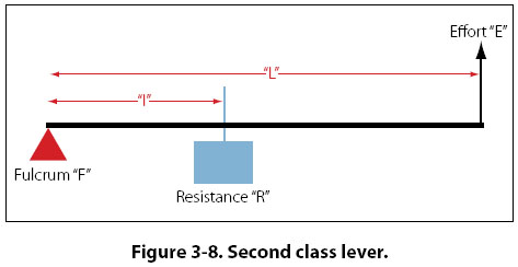 Both first and second class levers are commonly used to help in overcoming big resistances with a relatively small effort. The first class lever, however, is more versatile. Depending on how close or how far away the weight is placed from the fulcrum, the first class lever can be made to gain force or gain distance, but not both at the same time. The second class lever can only be made to gain force. Example: The distance from the center of the wheel to the handles on a wheelbarrow is 60 inches. The weight in the bucket is 18 inches from the center of the wheel. If 300 lb is placed in the bucket, how much force must be applied at the handles to lift the wheelbarrow? Effort (E) × Effort Arm (L) = Resistance (R) × Resistance Arm (l) The mechanical advantage of the lever in this example would be: Mechanical Advantage = Force Out ÷ Force In |