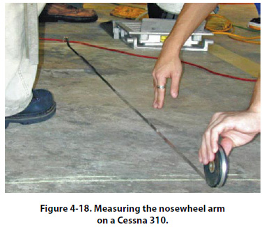 Oil System For aircraft certified since 1978, full engine oil is typically included in an aircraft’s empty weight. This can be confirmed by looking at the Type Certificate Data Sheet. If full oil is to be included, the oil level needs to be checked and the oil system serviced if it is less than full. If the Aircraft Specifications or Type Certificate Data Sheet specifies that only residual oil is part of empty weight, this can be accommodated by one of the following two methods. 1. Drain the engine oil system to the point that only residual oil remains. 2. Check the engine oil quantity, and mathematically subtract the weight of the oil that would leave only the residual amount. The standard weight for lubricating oil is 7.5 lb/gal (1.875 pounds per quart (lb/qt)), so if 7 qt of oil needed to be removed, the technician would subtract 13.125 lb at the appropriate arm. Miscellaneous Fluids Unless otherwise noted in the Aircraft Specifications or manufacturer’s instructions, hydraulic reservoirs and systems should be filled, drinking and washing water reservoirs and lavatory tanks should be drained, and constant speed drive oil tanks should be filled. Flight Controls The position of such items as spoilers, slats, flaps, and helicopter rotor systems is an important factor when weighing an aircraft. Always refer to the manufacturer’s instructions for the proper position of these items. Other Considerations Inspect the aircraft to see that all items included in the certificated empty weight are installed in the proper location. Remove items that are not regularly carried in flight. Also look in the baggage compartments to make sure they are empty. Replace all inspection plates, oil and fuel tank caps, junction box covers, cowling, doors, emergency exits, and other parts that have been removed. All doors, windows, and sliding canopies should be in their normal flight position. Remove excessive dirt, oil, grease, and moisture from the aircraft. Some aircraft are not weighed with the wheels on the scales, but are weighed with the scales placed either at the jacking points or at special weighing points. Regardless of what provisions are made for placing the aircraft on the scales or jacks, be careful to prevent it from falling or rolling off, thereby damaging the aircraft and equipment. When weighing an aircraft with the wheels placed on the scales, release the brakes to reduce the possibility of incorrect readings caused by side loads on the scales. All aircraft have leveling points or lugs, and care must be taken to level the aircraft, especially along the longitudinal axis. With light, fixed-wing airplanes, the lateral level is not as critical as it is with heavier airplanes. However, a reasonable effort should be made to level the light airplanes along the lateral axis. Helicopters must be level longitudinally and laterally when they are weighed. Accuracy in leveling all aircraft longitudinally cannot be overemphasized. Weighing Points When an aircraft is being weighed, the arms must be known for the points where the weight of the aircraft is being transferred to the scales. If a tricycle gear small airplane has its three wheels sitting on floor scales, the weight transfer to each scale happens through the center of the axle for each wheel. If an airplane is weighed while it is on jacks, the weight transfer happens through the center of the jack pad. For a helicopter with skids for landing gear, determining the arm for the weighing points can be difficult if the skids are sitting directly on floor scales. The problem is that the skid is in contact with the entire top portion of the scale, and it is impossible to know exactly where the center of weight transfer is occurring. In such a case, place a piece of pipe between the skid and the scale, and the center of the pipe will now be the known point of weight transfer. The arm for each of the weighing points is the distance from the center of the weight transfer point to the aircraft’s datum. If the arms are not known, based on previous weighing of the aircraft or some other source of data, they must be measured when the aircraft is weighed. This involves dropping a plumb bob from the center of each weighing point and from the aircraft datum, and putting a chalk mark on the hangar floor representing each point. The perpendicular distance between the datum and each of the weighing points can then be measured. In Figure 4-18, the distance from the nosewheel centerline to the datum is being measured on a Cessna 310 airplane. Notice the chalk lines on the hangar floor, which came as a result of dropping a plumb bob from the nosewheel axle centerline and from the datum. The nosewheel sitting on an electronic scale can be seen in the background.