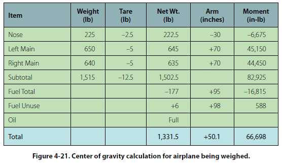 To calculate the airplane’s empty weight and empty weight center of gravity, a six column chart is used. Figure 4-21 shows the calculation for the airplane in Figure 4-20.