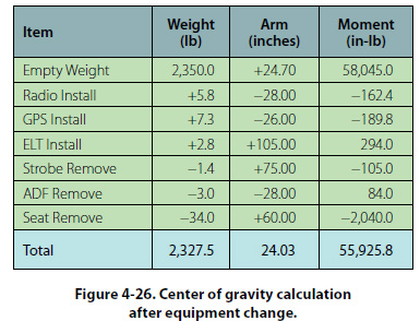 Equipment Change and Aircraft Alteration When the equipment in an aircraft is changed, such as the installation of a new radar system or ground proximity warning system, or the removal of a radio or seat, the weight and balance of an aircraft will change. An alteration performed on an aircraft, such as a cargo door being installed or a reinforcing plate being attached to the spar of a wing, will also change the weight and balance of an aircraft. Any time the equipment is changed or an alteration is performed, the new empty weight and empty weight center of gravity must be determined. This can be accomplished by placing the aircraft on scales and weighing it, or by mathematically calculating the new weight and balance. The mathematical calculation is acceptable if the exact weight and arm of all the changes are known. Example Calculation After an Equipment Change A small twin-engine airplane has some new equipment installed, and some of its existing equipment removed. The details of the equipment changes are as follows: