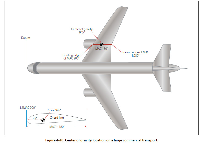 Mean Aerodynamic Chord On small airplanes and on all helicopters, the center of gravity location is identified as being a specific number of inches from the datum. The center of gravity range is identified the same way. On larger airplanes, from private business jets to large jumbo jets, the center of gravity and its range are typically identified in relation to the width of the wing. The width of the wing on an airplane is known as the chord. If the leading edge and trailing edge of a wing are parallel to each other, the chord of the wing is the same along the wing’s length. Business jets and commercial transport airplanes have wings that are tapered and that are swept back, so the width of their wings is different along their entire length. The width is greatest where the wing meets the fuselage and progressively decreases toward the tip. In relation to the aerodynamics of the wing, the average length of the chord on these tapered swept-back wings is known as the mean aerodynamic chord (MAC). On these larger airplanes, the CG is identified as being at a location that is a specific percent of the mean aerodynamic chord (% MAC). For example, imagine that the MAC on a particular airplane is 100", and the CG falls 20" behind the leading edge of the MAC. That means it falls one-fifth of the way back, or at 20% of the MAC. Figure 4-40 shows a large twin-engine commercial transport airplane. The datum is forward of the nose of the airplane, and all the arms shown in the figure are being measured from that point. The center of gravity for the airplane is shown as an arm measured in inches. In the lower left corner of the figure, a cross section of the wing is shown, with the same center of gravity information being presented.