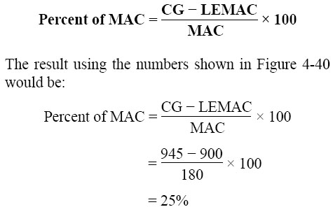 To convert the center of gravity location from inches to a percent of MAC, for the airplane shown in Figure 4-40, the steps are as follows: 1. Identify the center of gravity location, in inches from the datum. 2. Identify the leading edge of the MAC (LEMAC), in inches from the datum. 3. Subtract LEMAC from the CG location. 4. Divide the difference by the length of the MAC. 5. Convert the result in decimals to a percentage by multiplying by 100. As a formula, the solution to solve for the percent of MAC would be: