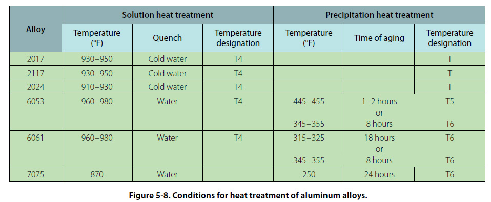 Straightening After Solution Heat Treatment Some warping occurs during solution heat treatment, producing kinks, buckles, waves, and twists. These imperfections are generally removed by straightening and flattening operations. Where the straightening operations produce an appreciable increase in the tensile and yield strengths and a slight decrease in the percent of elongation, the material is designated -T3 temper. When the above values are not materially affected, the material is designated -T4 temper. Precipitation Heat Treating As previously stated, the aluminum alloys are in a comparatively soft state immediately after quenching from a solution heat-treating temperature. To obtain their maximum strengths, they must be either naturally aged or precipitation hardened. During this hardening and strengthening operation, precipitation of the soluble constituents from the supersaturated solid solution takes place. As precipitation progresses, the strength of the material increases, often by a series of peaks, until a maximum is reached. Further aging (overaging) causes the strength to steadily decline until a somewhat stable condition is obtained. The submicroscopic particles that are precipitated provide the keys or locks within the grain structure and between the grains to resist internal slippage and distortion when a load of any type is applied. In this manner, the strength and hardness of the alloy are increased. Precipitation hardening produces a great increase in the strength and hardness of the material with corresponding decreases in the ductile properties. The process used to obtain the desired increase in strength is therefore known as aging, or precipitation hardening The strengthening of the heat-treatable alloys by aging is not due merely to the presence of a precipitate. The strength is due to both the uniform distribution of a finely dispersed submicroscopic precipitate and its effects upon the crystal structure of the alloy. The aging practices used depend upon many properties other than strength. As a rule, the artificially aged alloys are slightly overaged to increase their resistance to corrosion. This is especially true with the artificially aged high copper content alloys that are susceptible to intergranular corrosion when inadequately aged. The heat-treatable aluminum alloys are subdivided into two classes: those that obtain their full strength at room temperature and those that require artificial aging. The alloys that obtain their full strength after 4 or 5 days at room temperature are known as natural aging alloys. Precipitation from the supersaturated solid solution starts soon after quenching, with 90 percent of the maximum strength generally being obtained in 24 hours. Alloys 2017 and 2024 are natural aging alloys. The alloys that require precipitation thermal treatment to develop their full strength are artificially aged alloys. However, these alloys also age a limited amount at room temperature, the rate and extent of the strengthening depending upon the alloys. Many of the artificially aged alloys reach their maximum natural or room temperature aging strengths after a few days. These can be stocked for fabrication in the -T4 or -T3 temper. High zinc content alloys such as 7075 continue to age appreciably over a long period of time, their mechanical property changes being sufficient to reduce their formability. The advantage of -W temper formability can be utilized, however, in the same manner as with natural aging alloys; that is, by fabricating shortly after solution heat treatment, or retaining formability by the use of refrigeration. Refrigeration retards the rate of natural aging. At 32 °F, the beginning of the aging process is delayed for several hours, while dry ice (-50 °F to -100 °F) retards aging for an extended period of time. Precipitation Practices The temperatures used for precipitation hardening depend upon the alloy and the properties desired, ranging from 250 °F to 375 °F. They should be controlled within a very narrow range (±5 °F) to obtain best results. [Figure 5-8]