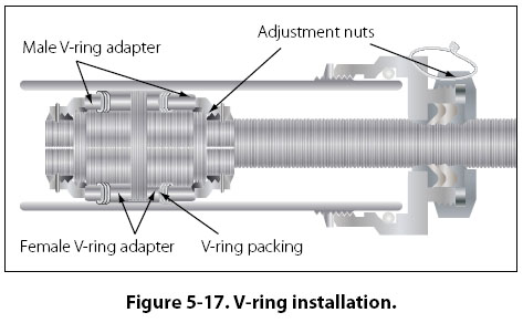 V-Ring Packings V-ring packings (AN6225) are one-way seals and are always installed with the open end of the “V" facing the pressure. V-ring packings must have a male and female adapter to hold them in the proper position after installation. It is also necessary to torque the seal retainer to the value specified by the manufacturer of the component being serviced, or the seal may not give satisfactory service. An installation using V-rings is shown in Figure 5-17.