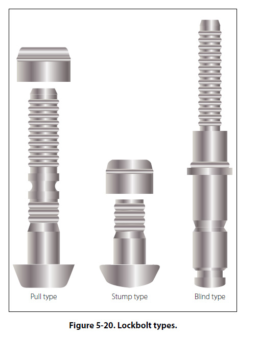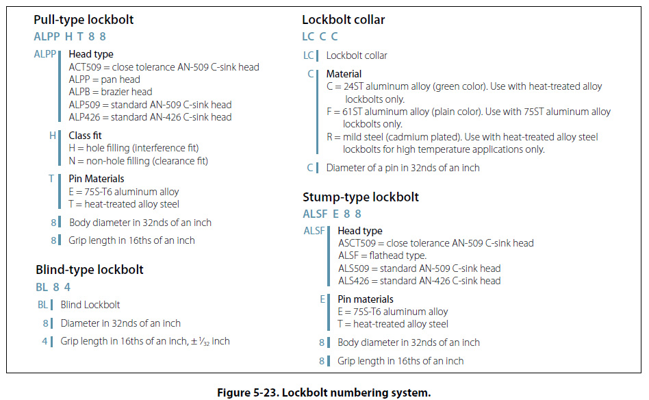 Pull type. Pull-type lockbolts are used mainly in aircraft primary and secondary structures. They are installed very rapidly and have approximately one-half the weight of equivalent AN steel bolts and nuts. A special pneumatic “pull gun" is required to install this type of lockbolt. Installation can be accomplished by one person since bucking is not required. Stump type. Stump-type lockbolts, although they do not have the extended stem with pull grooves, are companion fasteners to pull-type lockbolts. They are used primarily where clearance will not permit installation of the pull-type lockbolt. A standard pneumatic riveting hammer (with a hammer set attached for swaging the collar into the pin locking grooves) and a bucking bar are tools necessary for the installation of stump-type lockbolts. Blind type. Blind-type lockbolts come as complete units or assemblies. They have exceptional strength and sheet pull-together characteristics. Blind lockbolts are used where only one side of the work is accessible and, generally, where it is difficult to drive a conventional rivet. This type of lockbolt is installed in the same manner as the pull-type lockbolt. Common features. Common features of the three types of lockbolts are the annular locking grooves on the pin and the locking collar which is swaged into the pin’s lock grooves to lock the pin in tension. The pins of the pull- and blind-type lockbolts are extended for pull installation. The extension is provided with pulling grooves and a tension breakoff groove. Composition. The pins of pull- and stump-type lockbolts are made of heat-treated alloy steel or high strength aluminum alloy. Companion collars are made of aluminum alloy or mild steel. The blind lockbolt consists of a heat-treated alloy steel pin, blind sleeve and filler sleeve, mild steel collar, and carbon steel washer. Substitution. Alloy steel lockbolts may be used to replace steel high-shear rivets, solid steel rivets, or AN bolts of the same diameter and head type. Aluminum alloy lockbolts may be used to replace solid aluminum alloy rivets of the same diameter and head type. Steel and aluminum alloy lockbolts may also be used to replace steel and 2024T aluminum alloy bolts, respectively, of the same diameter. Blind lockbolts may be used to replace solid aluminum alloy rivets, stainless steel rivets, or all blind rivets of the same diameter. Numbering system. The numbering systems for the various types of lockbolts are explained by the breakouts in Figure 5-23.