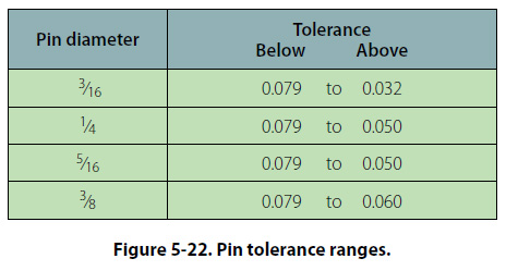 When installed, the lockbolt collar should be swaged substantially throughout the complete length of the collar. The tolerance of the broken end of the pin relative to the top of the collar must be within the dimensions given in Figure 5-22.