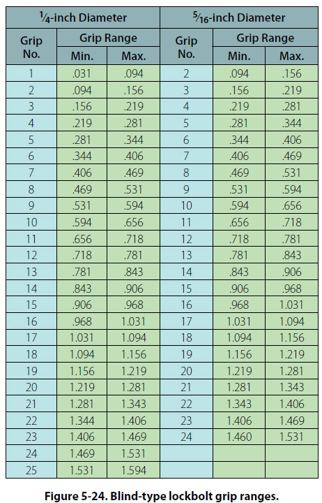 Grip Range. To determine the bolt grip range required for any application, measure the thickness of the material with a hook scale inserted through the hole. Once this measurement is determined, select the correct grip range by referring to the charts provided by the rivet manufacturer. Examples of grip range charts are shown in Figures 5-21 and 5-24.