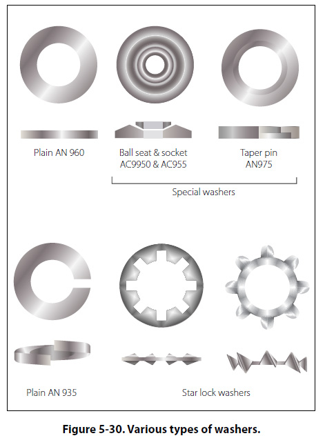 Shakeproof Lockwashers Shakeproof lockwashers are round washers designed with tabs or lips that are bent upward across the sides of a hex nut or bolt to lock the nut in place. There are various methods of securing the lockwasher to prevent it from turning, such as an external tab bent downward 90° into a small hole in the face of the unit, or an internal tab which fits a keyed bolt. Shakeproof lockwashers can withstand higher heat than other methods of safetying and can be used under high vibration conditions safely. They should be used only once because the tabs tend to break when bent a second time. Special Washers The ball socket and seat washers, AC950 and AC955, are special washers used where a bolt is installed at an angle to a surface, or where perfect alignment with a surface is required. These washers are used together. [Figure 5-30] The NAS143 and MS20002 washers are used for internal wrenching bolts of the NAS144 through NAS158 series. This washer is either plain or countersunk. The countersunk washer (designated as NAS143C and MS20002C) is used to seat the bolt head shank radius, and the plain washer is used under the nut. |