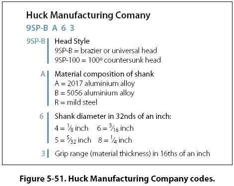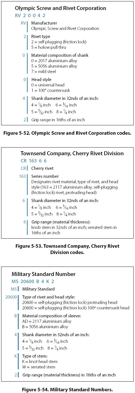 Rivet Identification Each company that manufactures self-plugging (friction lock) rivets has a code number to help users obtain the correct rivet for the grip range or material thickness of a particular installation. In addition, MS numbers are used for identification purposes. Figures 5-51 through 5-54 contain examples of part numbers for self-plugging (friction lock) rivets that are representative of each.