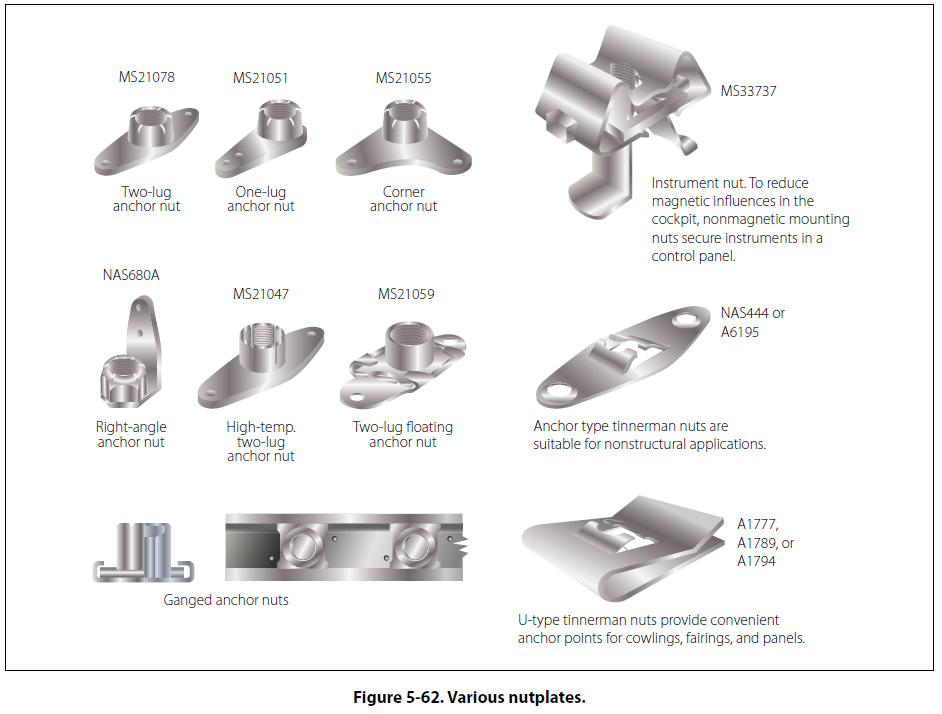 Riveted and Rivetless Nutplates When access to the back of a screw or bolt installation is impractical, riveted or rivetless nutplates are used to secure the connection of panels. One example in aircraft this technique is especially useful is to secure the floorboards to the stringers and to each other. Nutplates Nuts that are made to be riveted in place in aircraft are called nutplates. Their purpose is to allow bolts and screws to be inserted without having to hold the nut. They are permanently mounted to enable inspection panels and access doors to be easily removed and installed. When many screws are used on a panel, to make installation easier, normally floating anchor nuts are used. The floating anchor nut fits into a small bracket which is riveted to the aircraft skin. The nut is free to move, which makes it much easier to align it with the screw. For production ease, sometimes ganged anchor nuts are used for inspection panels. Ganged anchor nuts allow the nuts to float in a channel, making alignment with the screw easy. Self-locking nutplates are made under several standards and come in several shapes and sizes. Figure 5-62 shows an MS21078 two-lug nutplate with a nonmetallic insert, and an MS21047 lightweight, all-metal, 450 °F (232 °C) nutplate. Nutplates can also have three riveting points if the added strength is required.