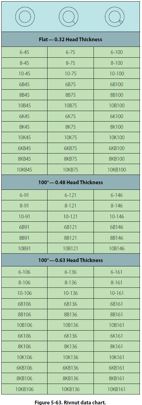 Rivnuts This is the trade name of a hollow, blind rivet made of 6053 aluminum alloy, counterbored and threaded on the inside. Rivnuts can be installed by one person using a special tool which heads the rivet on the blind side of the material. The Rivnut is threaded on the mandrel of the heading tool and inserted in the rivet hole. The heading tool is held at right angles to the material, the handle is squeezed, and the mandrel crank is turned clockwise after each stroke. Continue squeezing the handle and turning the mandrel crank of the heading tool until a solid resistance is felt, which indicates that the rivet is set. The Rivnut is used primarily as a nut plate and in the attachment of deicer boots to the leading edges of wings. It may be used as a rivet in secondary structures or for the attachment of accessories such as brackets, fairings, instruments, or soundproofing materials. Rivnuts are manufactured in two head types, each with two ends: the flathead with open or closed end, and the countersunk head with open or closed end. All Rivnuts, except the thin head countersunk type, are available with or without small projections (keys) attached to the head to keep the Rivnut from turning. Keyed Rivnuts are used as a nut plate, while those without keys are used for straight blind riveting repairs where no torque loads are imposed. A keyway cutter is needed when installing Rivnuts which have keys. The countersunk style Rivnut is made with two different head angles: the 100° with 0.048 and 0.063 inch head thickness, and the 115° with 0.063 inch head thickness. Each of these head styles is made in three sizes: 6-32, 8-32, and 10-32. These numbers represent the machine screw size of the threads on the inside of the Rivnut. The actual outside diameters of the shanks are 3/16 inch for the 6-32 size, 7/32 inch for the 8-32 size, and 1/4 inch for the 10-32 size. Open end Rivnuts are the most widely used and are recommended in preference to the closed end type wherever possible. However, closed end Rivnuts must be used in pressurized compartments. Rivnuts are manufactured in six grip ranges. The minimum grip length is indicated by a plain head, and the next higher grip length by one radial dash mark on the head. Each succeeding grip range is indicated by an additional radial dash mark until five marks indicate the maximum range.