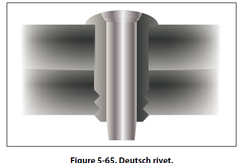 The Lok-Rivet and the Lok-Skru are alike in construction, except the Lok-Skru is tapped internally for fastening an accessory by using an attaching screw, whereas the Lok-Rivet is not tapped and can be used only as a rivet. Since both Lok-Skrus and Lok-Rivets are installed in the same manner, the following discus The main parts of a Lok-Skru are the barrel, the head, and an attachment screw. The barrel is made of aluminum alloy and comes in either closed or open ends. The head is either aluminum alloy or steel, and the attachment screw is made of steel. All of the steel parts are cadmium plated, and all of aluminum parts are anodized to resist corrosion. When installed, the barrel screws up over the head and grips the metal on the blind side. The attaching screw is then inserted if needed. There are two head types: the flathead and the countersunk head. The Lok-Skru is tapped for 7-32, 8-32, 10-32, or 10-24 screws, and the diameters vary from 0.230 inch for 6-32 screws, to 0.292 inch for 10-32 screws. Grip ranges vary from 0.010 inch to 0.225 inch. Deutsch Rivets This rivet is a high strength blind rivet used on late model aircraft. It has a minimum shear strength of 75,000 psi, and can be installed by one person. The Deutsch rivet consists of two parts: the stainless steel sleeve and the hardened steel drive pin. [Figure 5-65] The pin and sleeve are coated with a lubricant and a corrosion inhibitor.