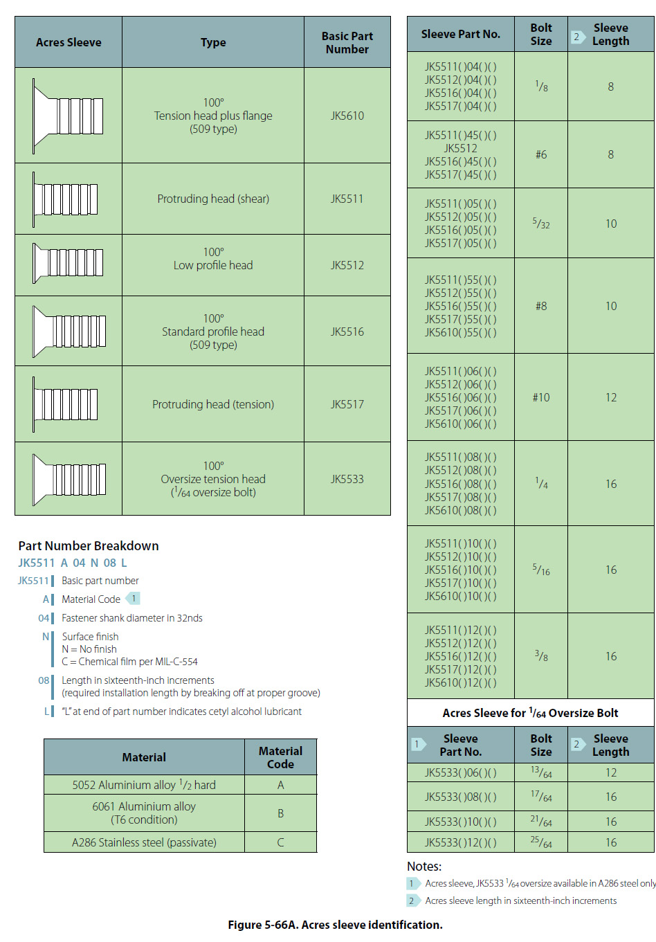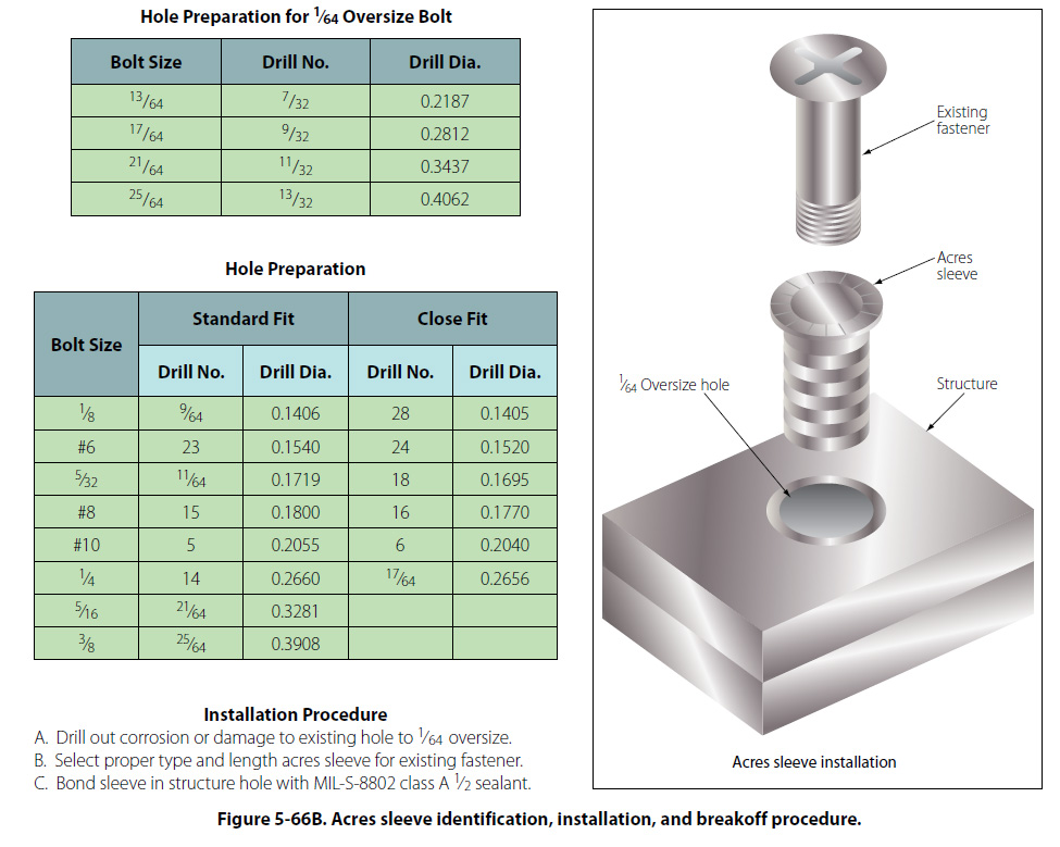 Hole Repair and Hole Repair Hardware Many of the blind fasteners are manufactured in oversized diameters to accommodate slightly enlarged holes resulting from drilling out the original fastener. When using rivets or even bolts, care must be taken to ensure the hole is not elongated or slanted. To reduce the chances of an incorrectly drilled rivet or bolt hole, use a slightly smaller drill bit first, then enlarge to the correct diameter. The last step to prepare the hole for the fastener is to deburr the hole using either a very large drill bit or a special deburring tool. This practice also works well when drilling out a previously attached fastener. If the drill bit does not exactly find the center of the rivet or bolt or screw, the hole can easily be elongated, but when using a smaller drill bit, drill the head only off the fastener, then the ring and stem that is left can be pushed out with a pin punch of the appropriate diameter. If an incorrectly drilled hole is found, the options are to redrill the hole to the next larger diameter for an acceptable fastener or repair the hole using an Acres fastener sleeve. Repair of Damaged Holes with Acres Fastener Sleeves Acres fastener sleeves are thin-wall tubular elements with a flared end. The sleeves are installed in holes to accept standard bolts and rivet-type fasteners. The existing fastener holes are drilled 1/64 inch oversize for installation of the sleeves. The sleeves are manufactured in 1-inch increments. Along their length, grooves provide a place to break or cut off excess length to match fastener grip range. The grooves also provide a place to hold adhesive or sealing agents when bonding the sleeve into the hole. Advantages and Limitations The sleeves are used in holes which must be drilled 1/64 inch oversize to clean up corrosion or other damage. The oversize hole with the sleeve installed allows the use of the original diameter fastener in the repaired hole. The sleeves can be used in areas of high galvanic corrosion where the corrosion must be confined to a readily replaceable part. Oversizing of holes reduces the net cross-sectional area of a part and should not be done unless absolutely required. Consult the manufacturer of the aircraft, aircraft engine or aircraft component prior to repair of damaged holes with Acres sleeves. Identification The sleeve is identified by a standard code number [Figure 5-66A] which represents the type and style of sleeve, a material code, the fastener shank diameter, surface finish code letter and grip tang for the sleeve.