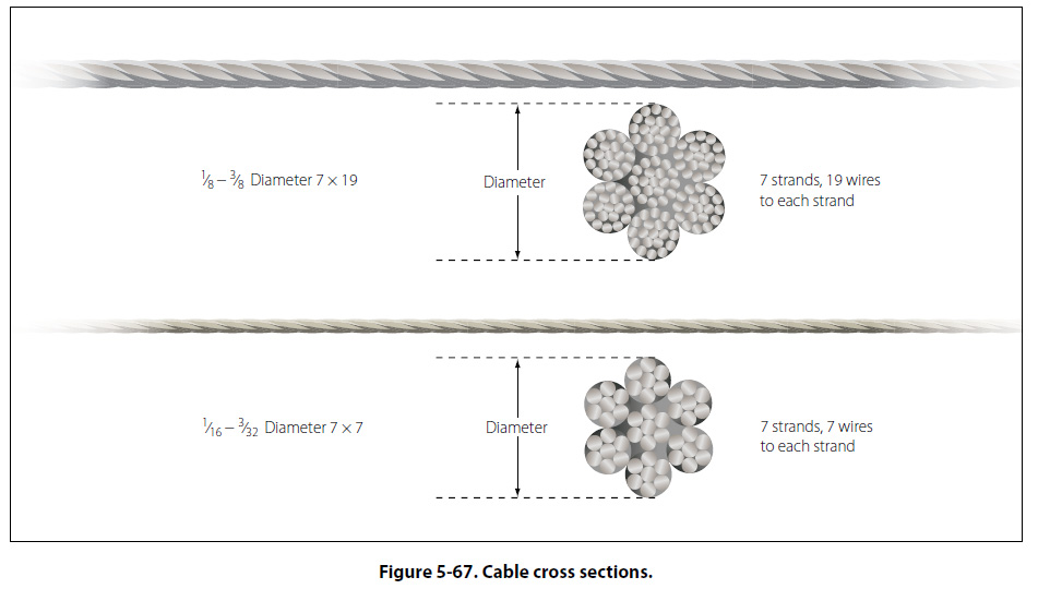 The sleeve may be installed with or without being bonded in the hole. When bonding the sleeve in a hole, use MIL-S-8802A1/2 sealant. Reinstall original size fastener and torque as required. Sleeve Removal Sleeves not bonded in the hole may be removed by either driving them out with a drift pin of the same diameter as the outside diameter of the sleeve or they may be deformed and removed with a pointed tool. Bonded sleeves may be removed by this method, but care should be used not to damage the structure hole. If this method cannot be used, drill the sleeves out with a drill 0.004 to 0.008 inch smaller than the installation drill size. The remaining portion of the sleeve after drilling can be removed using a pointed tool and applying an adhesive solvent to the sealant. Control Cables and Terminals Cables are the most widely used linkage in primary flight control systems. Cable-type linkage is also used in engine controls, emergency extension systems for the landing gear, and various other systems throughout the aircraft. Cable-type linkage has several advantages over the other types. It is strong and light weight, and its flexibility makes it easy to route through the aircraft. An aircraft cable has a high mechanical efficiency and can be set up without backlash, which is very important for precise control. Cable linkage also has some disadvantages. Tension must be adjusted frequently due to stretching and temperature changes. Aircraft control cables are fabricated from carbon steel or stainless steel. Cable Construction The basic component of a cable is a wire. The diameter of the wire determines the total diameter of the cable. A number of wires are preformed into a helical or spiral shape and then formed into a strand. These preformed strands are laid around a straight center strand to form a cable. Cable designations are based on the number of strands and the number of wires in each strand. The most common aircraft cables are the 7 × 7 and 7 × 19. The 7 × 7 cable consists of seven strands of seven wires each. Six of these strands are laid around the center strand. [Figure 5-67] This is a cable of medium flexibility and is used for trim tab controls, engine controls, and indicator controls.