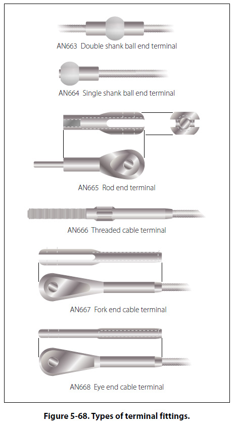 The 7 × 19 cable is made up of seven strands of 19 wires each. Six of these strands are laid around the center strand. [Figure 5-67] This cable is extra flexible and is used in primary control systems and in other places where operation over pulleys is frequent. Aircraft control cables vary in diameter, ranging from 1/16 to 3/8 inch. The diameter is measured as shown in Figure 5-67. Cable Fittings Cables may be equipped with several different types of fittings, such as terminals, thimbles, bushings, and shackles. Terminal fittings are generally of the swaged type. They are available in the threaded end, fork end, eye end, single shank ball end, and double shank ball end. The threaded end, fork end, and eye end terminals are used to connect the cable to a turnbuckle, bellcrank, or other linkage in the system. The ball end terminals are used for attaching cables to quadrants and special connections where space is limited. Figure 5-68 illustrates the various types of terminal fittings.