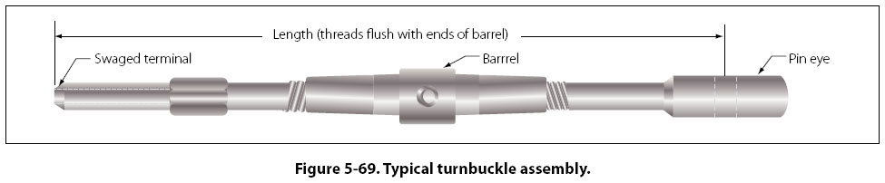 The thimble, bushing, and shackle fittings may be used in place of some types of terminal fittings when facilities and supplies are limited and immediate replacement of the cable is necessary. Turnbuckles A turnbuckle assembly is a mechanical screw device consisting of two threaded terminals and a threaded barrel. [Figure 5-69]