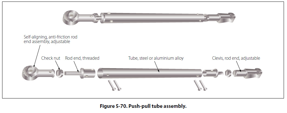 [Figure 5-70] The checknuts secure the end fittings after the tube assembly has been adjusted to its correct length. Push-pull tubes are generally made in short lengths to prevent vibration and bending under compression loads. |