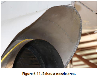 Inspection Inspection for corrosion is a continuing problem and should be handled on a daily basis. Overemphasizing a particular corrosion problem when it is discovered and then forgetting about corrosion until the next crisis is an unsafe, costly, and troublesome practice. Most scheduled maintenance checklists are complete enough to cover all parts of the aircraft or engine, and no part of the aircraft should go uninspected. Use these checklists as a general guide when an area is to be inspected for corrosion. Through experience it will be learned that most aircraft have trouble areas where, despite routine inspection and maintenance, corrosion will set in. In addition to routine maintenance inspections, amphibians or seaplanes should be checked daily and critical areas cleaned or treated, as necessary. Corrosion Prone Areas Discussed briefly in this section are most of the trouble areas common to all aircraft. However, this coverage is not necessarily complete and may be amplified and expanded to cover the special characteristics of the particular aircraft model involved by referring to the applicable maintenance manual. Exhaust Trail Areas Both jet and reciprocating engine exhaust deposits are very corrosive and give particular trouble where gaps, seams, hinges, and fairings are located downstream from the exhaust pipes or nozzles. [Figure 6-11]