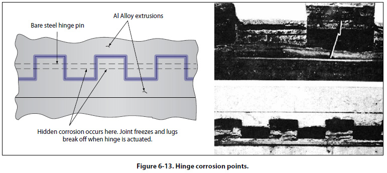 Wheel Well and Landing Gear More than any other area on the aircraft, this area probably receives more punishment due to mud, water, salt, gravel, and other flying debris. Because of the many complicated shapes, assemblies, and fittings, complete area paint film coverage is difficult to attain and maintain. A partially applied preservative tends to mask corrosion rather than prevent it. Due to heat generated by braking action, preservatives cannot be used on some main landing gear wheels. During inspection of this area, pay particular attention to the following trouble spots: 1. Magnesium wheels, especially around bolt heads, lugs, and wheel web areas, particularly for the presence of entrapped water or its effects 2. Exposed rigid tubing, especially at B-nuts and ferrules, under clamps and tubing identification tapes 3. Exposed position indicator switches and other electrical equipment 4. Crevices between stiffeners, ribs, and lower skin surfaces, which are typical water and debris traps Water Entrapment Areas Design specifications require that aircraft have drains installed in all areas where water may collect. Daily inspection of low point drains should be a standard requirement. If this inspection is neglected, the drains may become ineffective because of accumulated debris, grease, or sealants. Engine Frontal Areas and Cooling Air Vents These areas are being constantly abraded with airborne dirt and dust, bits of gravel from runways, and rain erosion, which tends to remove the protective finish. Inspection of these areas should include all sections in the cooling air path, with special attention to places where salt deposits may be built up during marine operations. It is imperative that incipient corrosion be inhibited and that paint touchup and hard film preservative coatings are maintained intact on seaplane and amphibian engine surfaces at all times. Wing Flap and Spoiler Recesses Dirt and water may collect in flap and spoiler recesses and go unnoticed because they are normally retracted. For this reason, these recesses are potential corrosion problem areas. Inspect these areas with the spoilers and/or flaps in the fully deployed position. External Skin Areas External aircraft surfaces are readily visible and accessible for inspection and maintenance. Even here, certain types of configurations or combinations of materials become troublesome under certain operating conditions and require special attention. Relatively little corrosion trouble is experienced with magnesium skins if the original surface finish and insulation are adequately maintained. Trimming, drilling, and riveting destroy some of the original surface treatment, which is never completely restored by touchup procedures. Any inspection for corrosion should include all magnesium skin surfaces with special attention to edges, areas around fasteners, and cracked, chipped, or missing paint. Piano-type hinges are prime spots for corrosion due to the dissimilar metal contact between the steel pin and aluminum hinge. They are also natural traps for dirt, salt, and moisture. Inspection of hinges should include lubrication and actuation through several cycles to ensure complete lubricant penetration. Use water-displacing lubricants when servicing piano hinges. [Figures 6-12 and 6-13]