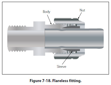 MS Flareless Fittings MS flareless fittings are designed primarily for highpressure (3,000 psi) hydraulic systems that may be subjected to severe vibration or fluctuating pressure. Using this type of fitting eliminates all tube flaring, yet provides a safe and strong, dependable tube connection. [Figure 7-17] The fitting consists of three parts: a body, a sleeve, and a nut.