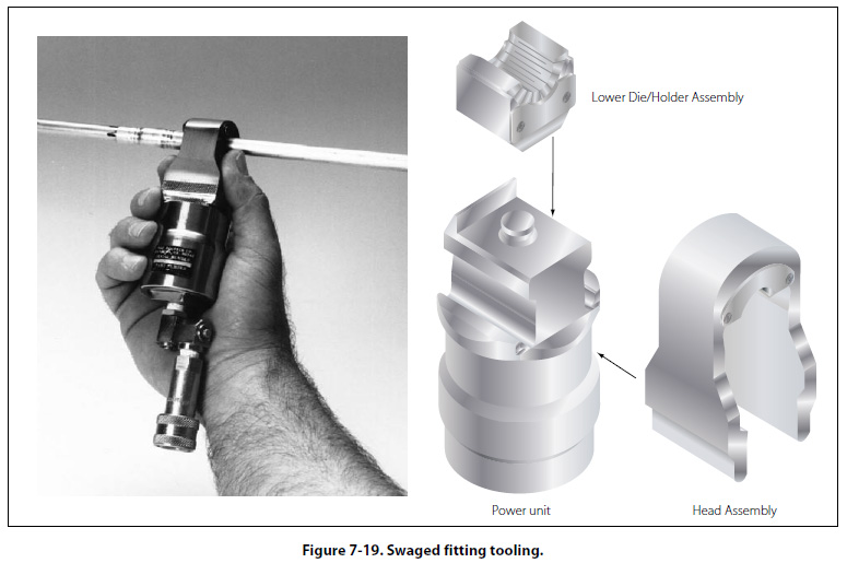 The counterbore shoulder within the body is designed with a reverse angle of 15° for steel connectors and 45° for aluminum fittings. This reverse angle prevents inward collapse of the tubing when tightened and provides a partial sealing force to be exerted against the periphery of the body counterbore. Swaged Fittings A popular repair system for connecting and repairing hydraulic lines on transport category aircraft is the use of Permaswage™ fittings. Swaged fittings create a permanent connection that is virtually maintenance free. Swaged fittings are used to join hydraulic lines in areas where routine disconnections are not required and are often used with titanium and corrosion resistant steel tubing. The fittings are installed with portable hydraulically powered tooling, which is compact enough to be used in tight spaces. [Figure 7-19] If the fittings need to be disconnected, cut the tubing with a tube cutter.