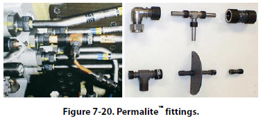 Special installation tooling is available in portable kits. Always use the manufacturer’s instructions to install swaged fittings. One of the latest developments is the Permalite™ fitting. Permalite™ is a tube fitting that is mechanically attached to the tube by axial swaging. The movement of the ring along the fitting body results in deformation of the tube with a leak-tight joint. [Figure 7-20]