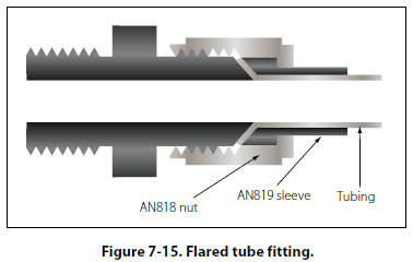 Universal Bulkhead Fittings When a fluid line passes through a bulkhead, and it is desired to secure the line to the bulkhead, a bulkhead fitting should be used. The end of the fitting that passes through the bulkhead is longer than the other end(s), which allows a locknut to be installed, securing the fitting to the bulkhead. Fittings attach one piece of tubing to another, or to system units. There are four types: (1) bead and clamp, (2) flared fittings, (3) flareless fittings, and (4) permanent fittings (Permaswage™, Permalite™, and Cyrofit™). The amount of pressure that the system carries and the material used are usually the deciding factors in selecting a connector. The beaded type of fitting, which requires a bead and a section of hose and hose clamps, is used only in low- or medium-pressure systems, such as vacuum and coolant systems. The flared, flareless, or permanenttype fittings may be used as connectors in all systems, regardless of the pressure. AN Flared Fittings A flared tube fitting consists of a sleeve and a nut, as shown in Figure 7-15. The nut fits over the sleeve and, when tightened, draws the sleeve and tubing flare tightly against a male fitting to form a seal. Tubing used with this type of fitting must be flared before installation. The male fitting has a cone-shaped surface with the same angle as the inside of the flare. The sleeve supports the tube so that vibration does not concentrate